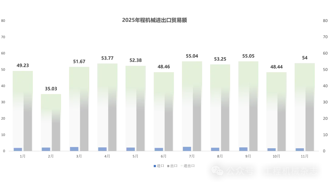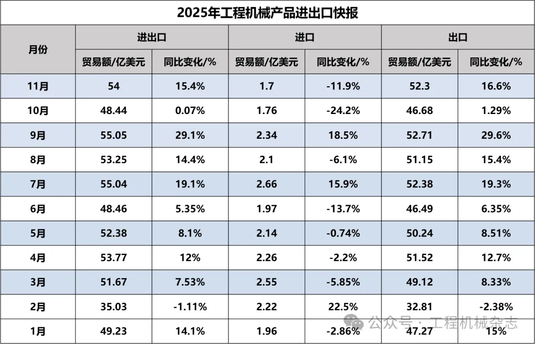 据海关数据整理,2025年11月我国工程机械进出口贸易额为54亿美元,同比增长15.4%,其中:进口额1.7亿美元,同比下降11.9%;出口额52.3亿美元,同比增长16.6%。